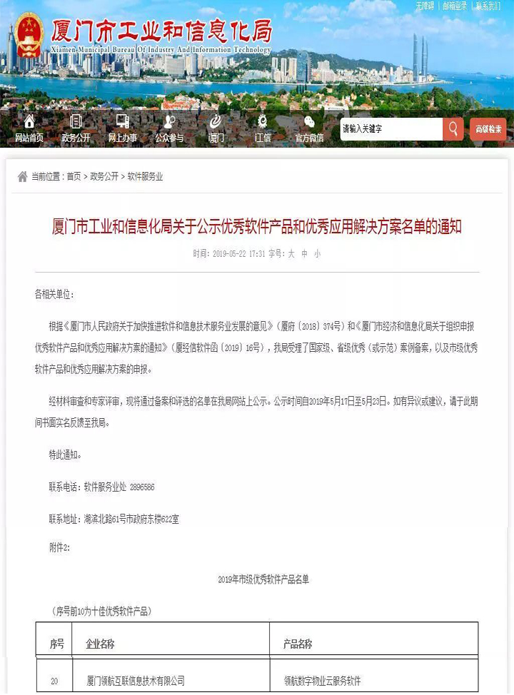经过严格材料审查和专家评审,厦门领航互联自主研发的“领航数字物业云服务软件”产品在厦门市工业和信息化局公布“厦门市优秀软件产品及优秀应用解决方案”入选名单中脱颖而出,荣获“2019年厦门市优秀软件产品”称号!这不仅对厦门领航互联2018年的工作交上了一份满意的答卷,也是2019年领航互联人开拓更广阔软件市场的一个莫大的鼓励。