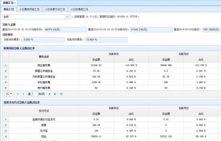 在【领导视窗】中,系统自动实时统计汇总各类报表,包括物业汇总、小区费用项目汇总、小区结算方式汇总、小区收费率汇总。管理者可以实时了解掌握各个分公司各个小区收费情况及运营数据,更有针对性的指导经营决策。操作简单高效,数据直观。