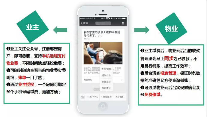 移动互联网时代,许多物业公司也纷纷希望自己的小区也能实现移动缴费。不论是微信还是支付宝物业缴费移动支付应用,其核心价值其实是在支付之外,因为如果仅仅是提供支付,一方面给物业提供的服务没有那么高的价值,也难以形成物业微信公众号与业主的粘性,另一方面也容易同质化。如果只是线上、线下支付的场景谁都可以做,接入进去难度并不大,重点是谁能够非常系统化地给物业提供全方位的服务,以及能否为物业行业去做更深度的融合和创新。