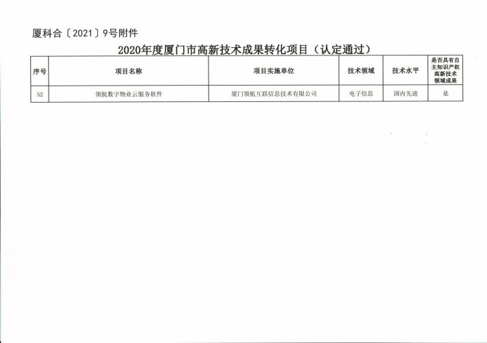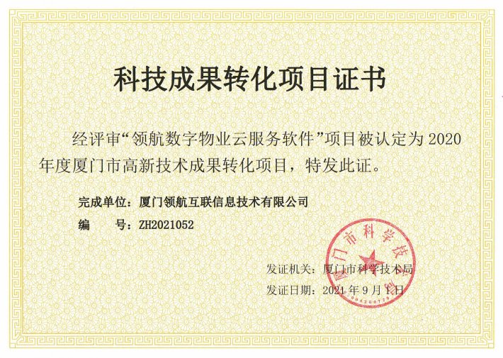 本次获得2020年度厦门市高新技术成果转化项目认定的《领航数字物业云服务软件》平台,一方面提升物业企业的内部管理能力、服务能力以及新技术应用,另一方面为业主提供了远程缴费、报修、通知公告、党员之家、业委会选举、满意度调查、电子发票、电子收据等线上服务,平台于2021年被评为“国务院双创示范基地示范项目”。目前,领航数字物业云平台辐射区域已达26个地市、数百万户家庭,通过平台缴交物业费143个亿、物业项目总数3000个+、累计培训物业人数4000名+,在厦门以及福建市场占有率第一,在全国市场名列前茅。