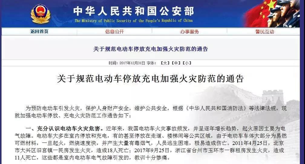 《关于规范电动车停放充电加强火灾防范的通告》