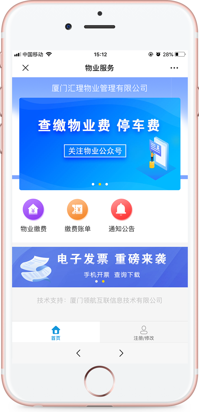 如今移动支付已经渗透进生活的方方面面,物业缴费也不例外。厦门汇理物业在上线领航云平台软件的同时,同步开通了“厦门汇理物业管理有限公司”微信服务号,经过领航互联对公众号的二次开发配置,让汇理物业公众号实现了业户随时随地查缴物业费、缴费账单查询、小区通知公告等便捷服务,后续还可以根据物业的需要开通公众号其他功能,如快捷报修、投诉建议,还可以对接其他的应用,如电子发票、停车系统......等等。