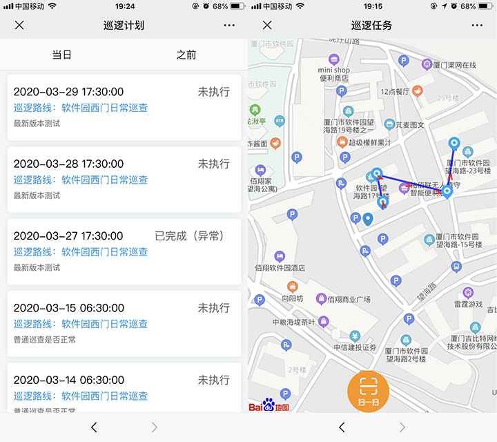 通过在安防巡查PC端系统对巡逻路线的设定和巡逻计划的安排,巡逻人员在手机端执行巡逻任务,执行巡逻任务时每到一个巡逻点需要通过智能手机扫描指定巡逻点二维码后完成定位打卡并提交巡逻情况,系统能够自动将巡逻人员在巡逻工作中的时间、地点及巡逻情况生成巡逻记录方便随时查询,并能根据巡逻记录产生日报表/周报表。