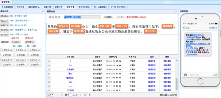 短信内容模板能够根据需要自定义设置,能够自动根据每户业主的实际欠费情况生成相应的短信内容,