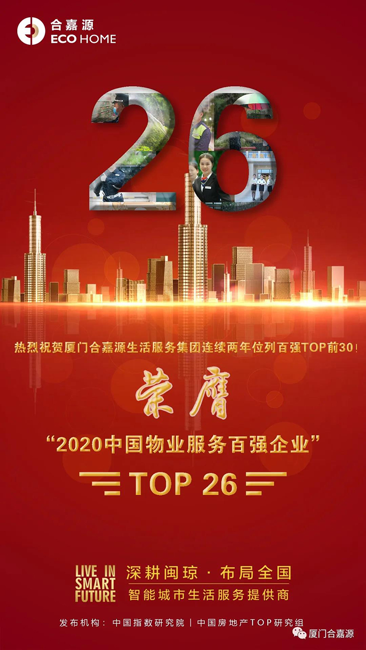 恭喜!厦门领航互联战略合作伙伴——厦门合嘉源生活服务集团有限责任公司在“2020中国物业服务百强企业研究成果发布会暨第十三届中国物业服务百强企业家峰会”上,荣膺“2020中国物业服务百强企业”第26位!
