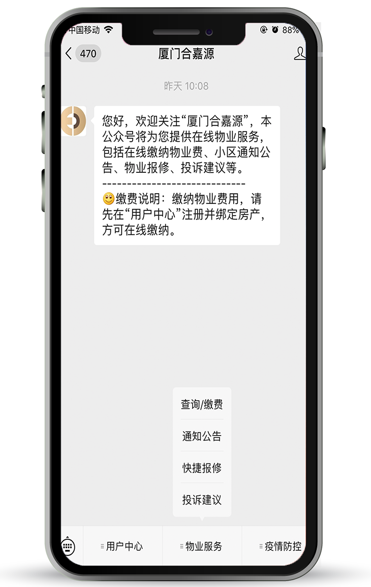 除此之外,合嘉源集团已开通微信公众号服务,形成以领航云平台管理+微信公众号线上服务双管齐下的模式,业主在“厦门合嘉源”物业公众号即可以查缴物业费欠费账单,足不出户即可缴纳物业费、一键报修、通知公告查看等,不仅解决居民的实际需求,方便小区居民生活便利,还将增加居民的幸福感和粘合度,塑造智慧服务新形象!