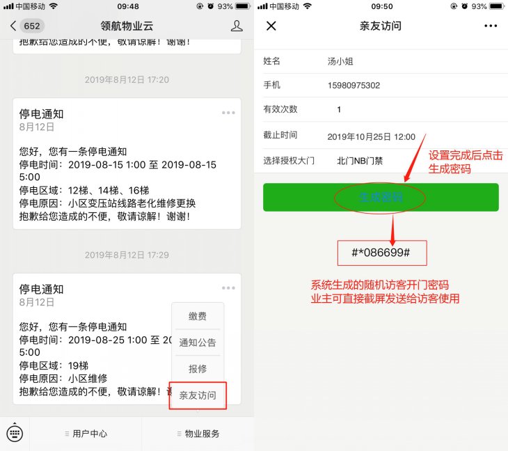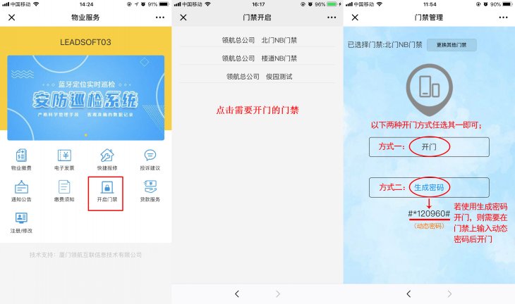 其中,微信开门有两种方式开启门禁方式:业主可以点击“开门”按钮,直接开门,也可以点击“生成密码”,使用设备开门码开门。