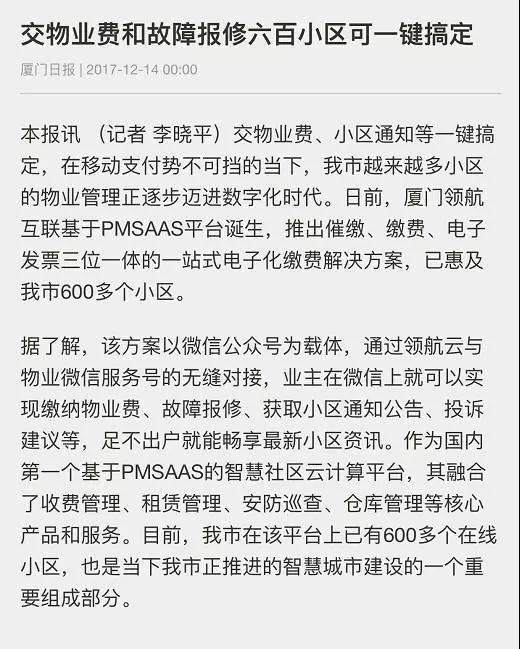 【喜讯】2017年12月14日,厦门日报对“领航云”智慧软件进行了特别报道,这也是对领航互联多年投身智慧物业软件研究、智慧社区建设的一次高度肯定。