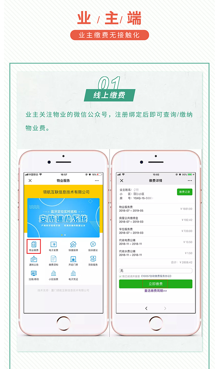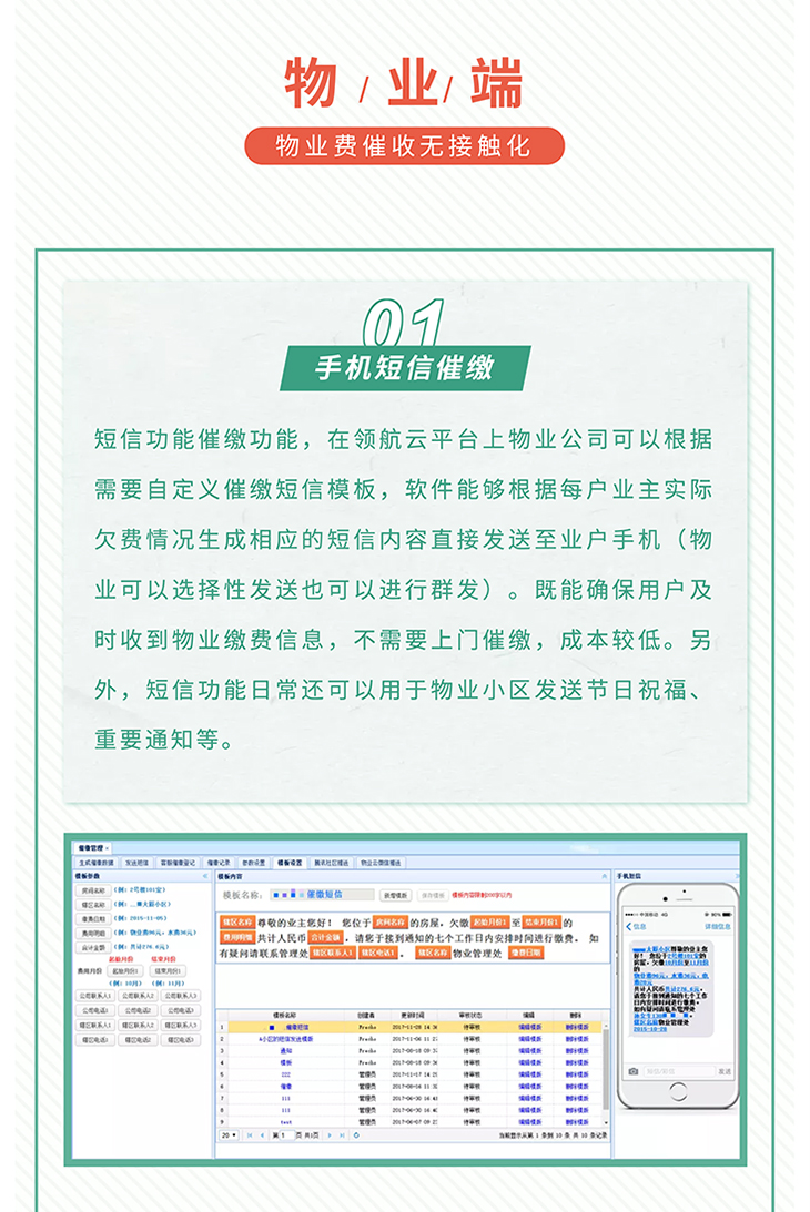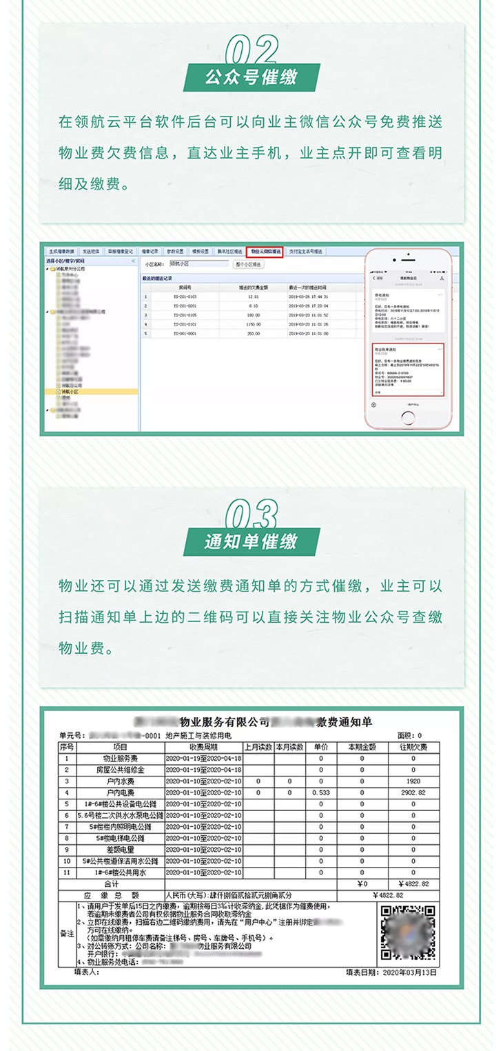 科技助力,物业防疫!当前,国内新冠肺炎疫情已逐渐得到控制,但仍不能放松警惕!减少外出和人员聚集,仍是防控新冠肺炎疫情最简单最有效的措施。 疫情期间,如何在物业防疫工作量暴增、无法面对面服务的情况下保障物业各项日常工作稳步进行,保证物业费催收、业主缴费不受疫情影响,资金回笼正常? 领航云平台 无接触式催缴 从物业催缴、业主缴费到电子发票的全程无接触化