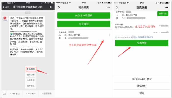业主可以直接通过物业公众号、支付宝生活号快速查询/缴纳物业费,物业能够实现软件后台同步销账(不需要收费员再去销账)
