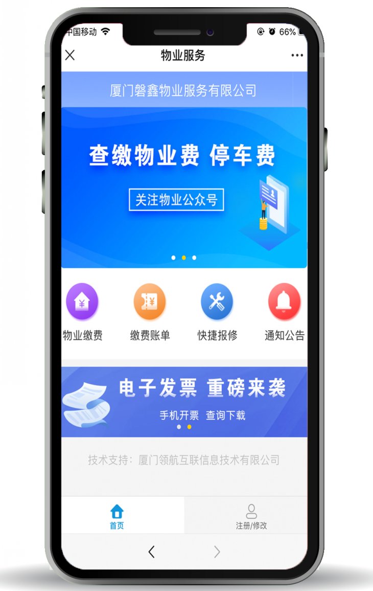 厦门磐鑫物业在上线领航云平台软件的同时,同步开通了“磐鑫物业云平台”微信公众号,并通过领航互联对公众号的二次开发,让“磐鑫物业云平台”公众号实现物业费查询/缴纳、快捷报修、投诉建议、通知公告等功能。业主可以体验足不出户查缴物业费的便利。