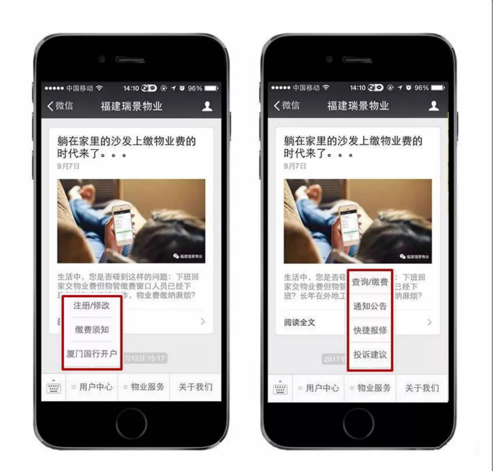 帮助物业企业的微信公众号实现在线手机远程缴纳物业管理费,即时同步到领航云平台,实时数据更新、省时省事,降低缴费出错率,业主足不出户就可以轻松缴纳物业费,提高物业费资金回笼率,同时还有账单催缴、小区通知公告、在线报修、投诉建议等功能。