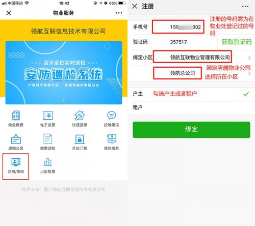 操作方法:①搜索您小区物业的微信公众号并关注公众号(以下以“领航物业云”公众号为例),②点击菜单中的【物业服务】,进入物业服务页面,③再点击【注册/修改】菜单进入注册页面,④输入您的手机号码、验证码→⑤选择小区物业公司→⑥选择所在的小区→⑦勾选户主或者租户,最后点击「绑定」。