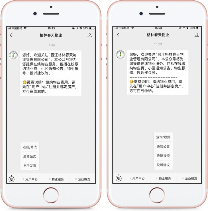同时,晋江格林春天物业在物业服务模式方面进行积极探索与实践,在上线智能物业软件的同时,同步开通了微信公众号服务,业主足不出户就可以轻松查缴物业费,在线报事报修,通知公告,投诉建议等,依托微信公众号,为物业打造线上社区服务智能平台,为业主提供便捷的一站式服务。