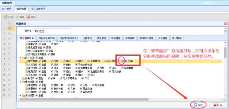 权限设置步骤:权限管理——角色管理——勾选角色——“修改面积”前打勾——保存
