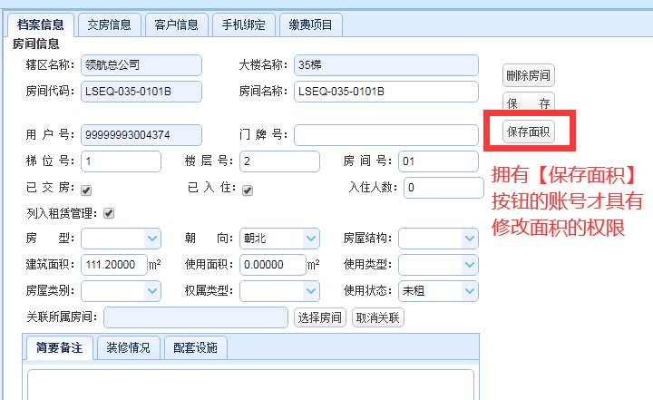 对于房产资源中的面积修改增加了权限控制。账号管理员为某个角色账号开通了面积修改权限后该账号才拥有【保存面积】按钮,该功能可以防止随意更改面积。(如下图)