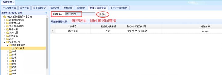 原来公众号催缴只能按照整个小区一起推送,现在新增了按楼栋推送和按房间推送两种推送方式。