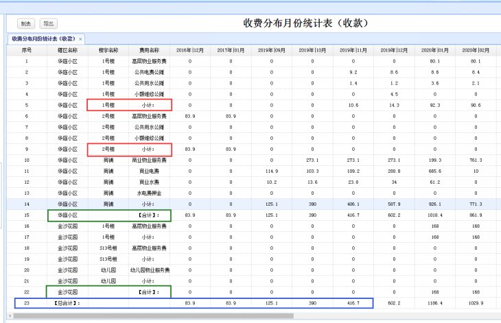 4、报表:收费分布月份统计表(收款),增加一列按楼宇统计。