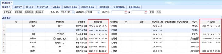 ①快捷报修的报修日期和完成时间精确到秒;