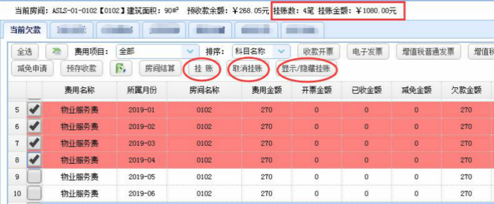 比如:业主小王欠费(2019年1月到6月份的物业费),经业主、地产及物业三方确认后2019年1月至4月物业费属于地产承担(但地产尚未付款),5月起的物业费开始由业主自己承担。现在上线挂账功能后,就可以先在业主房产名下对应的属于地产承担的欠费(2019年1月至4月物业费)选择挂起。挂起功能后,收取业主物业费预存款预交冲抵是只能冲抵2019年5月及以后的物业费,2019年1月-4月物业费欠费是冲抵不到。财务报表欠费统计表包含挂账状态下费用,也就是体现该业主1月至4月份物业费欠费明细。等地产承担的1月至4月物业费款项到的当月,选择取消挂账,然后选择对应的付款方式收清。