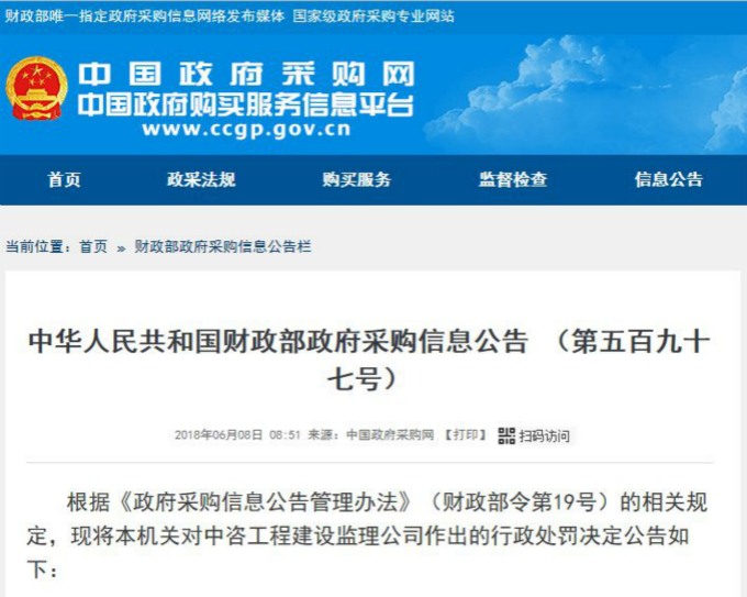 根据《政府采购信息公告管理办法》(财政部令第19号)的相关规定,现将本机关对中咨工程建设监理公司作出的行政处罚决定公告如下: