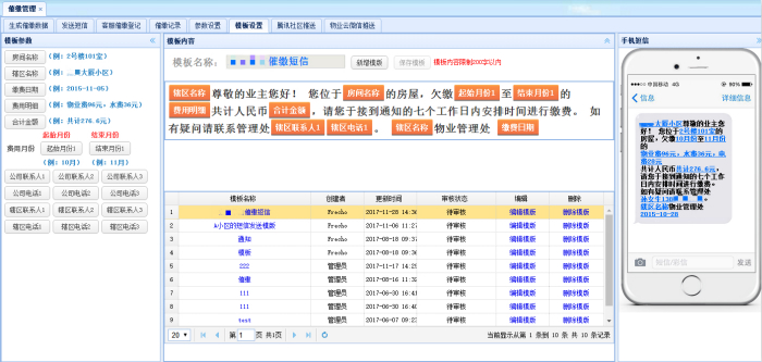 短信催缴的应用范围广泛,适用于所有小区所有业主。短信催缴是智能物业云系统上重要的催缴功能之一,在平台上物业公司可以根据需要自定义催缴短信模板,软件能够根据每户业主实际欠费情况生成相应的短信内容,物业可以选择性发送也可以群发至业户手机,(而市面上的短信系统无法做到根据业户实际欠费发送专属的短信,每条短信费用也较高)。