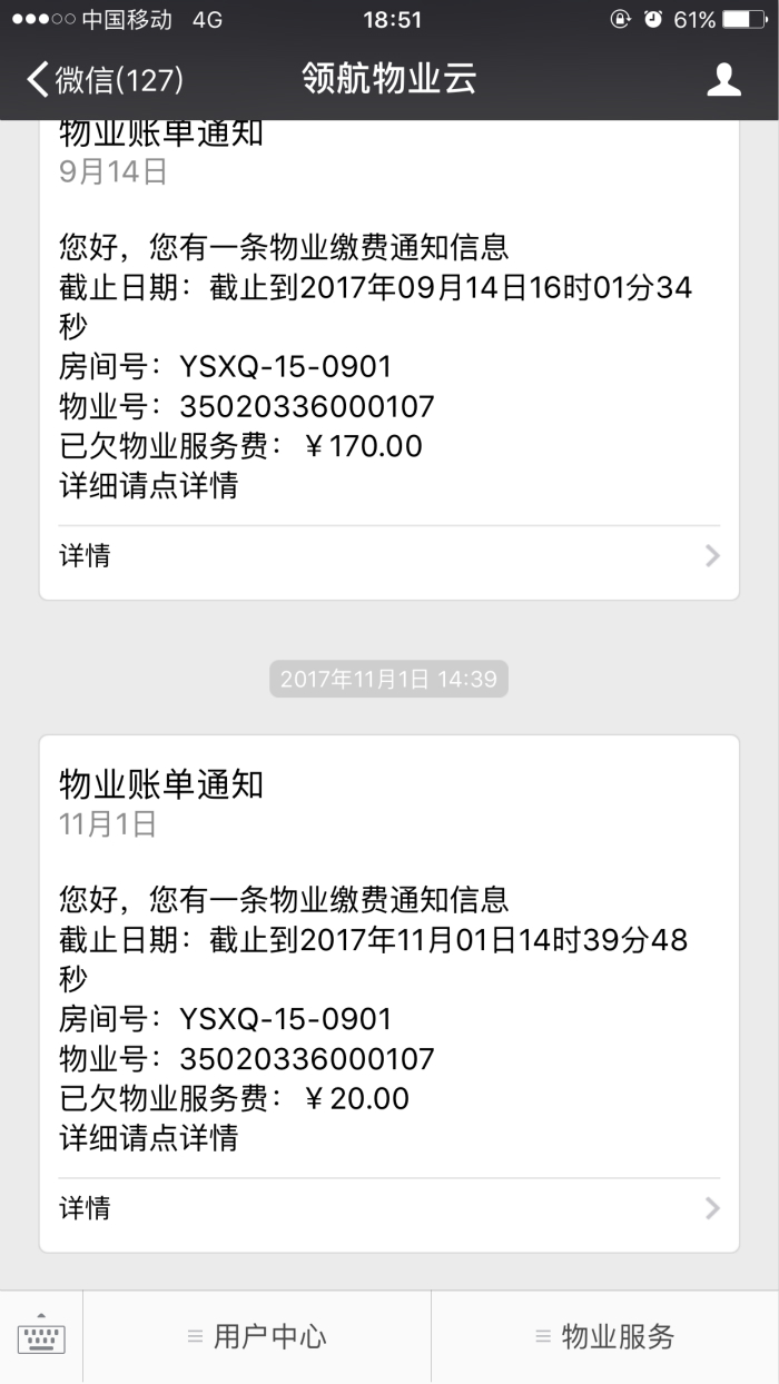 顺应当下移动支付的热潮,智能物业云软件完成了与微信公众号、支付宝的无缝对接。物业可以在物业云软件后台根据业主的欠费情况直接免费向业主进行物业费账单推送,已经关注物业公众号并注册绑定的业主,就可以收到自己的物业欠费账单,业主还可以通过公众号直接查询缴费。就算业主人在外地或者国外都能够很方便的进行费用查询及缴纳。