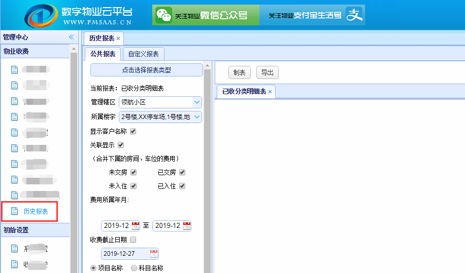 为了提高报表的运行效率,在数字物业云平台专门设置了历史报表查询菜单入口,对于2018年1月份之前的数据,请到历史报表中查询。