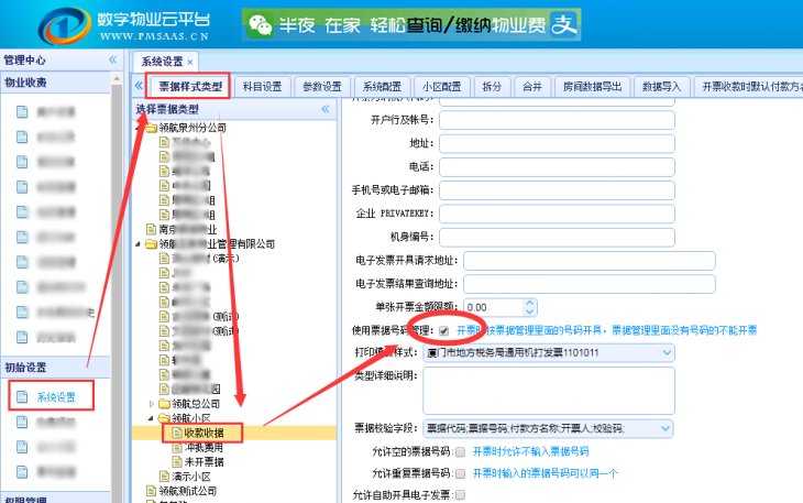系统设置→票据样式类型→对应小区的票据类型里面【使用票据号码管理】需要打勾。