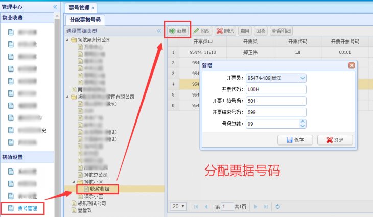 票号管理是对物业收款收据票号进行分配与管理。通过管理者事先给每个开票员分配票据号码段,开票时系统将会自动按票据管理里面个人所分配的号码开具,票据管理里面没有号码的不能开票