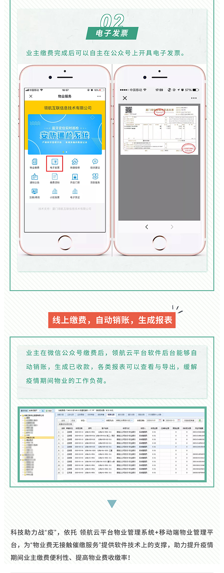 科技助力,物业防疫!当前,国内新冠肺炎疫情已逐渐得到控制,但仍不能放松警惕!减少外出和人员聚集,仍是防控新冠肺炎疫情最简单最有效的措施。 疫情期间,如何在物业防疫工作量暴增、无法面对面服务的情况下保障物业各项日常工作稳步进行,保证物业费催收、业主缴费不受疫情影响,资金回笼正常? 领航云平台 无接触式催缴 从物业催缴、业主缴费到电子发票的全程无接触化
